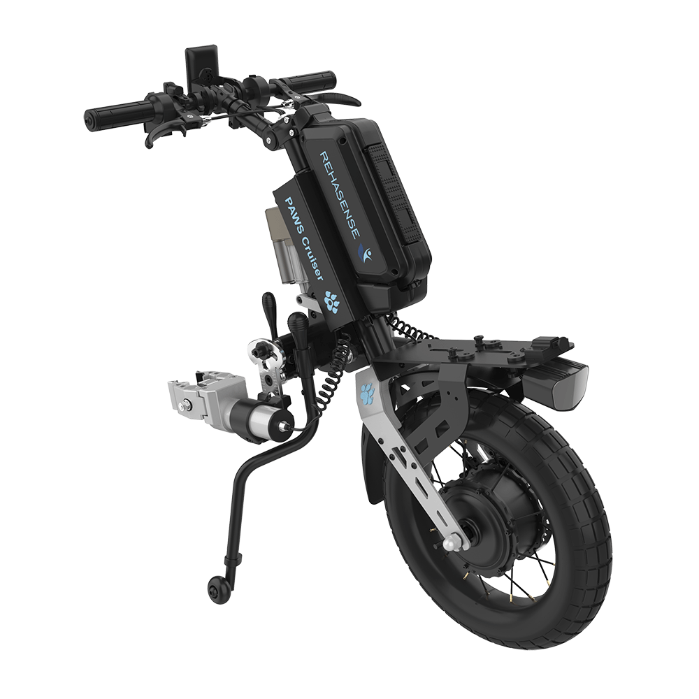 Discover the PAWS Cruiser, the ultimate power add-on for your wheelchair. Whether you’re navigating city streets or exploring forest trails, the PAWS Cruiser delivers a smooth and powerful ride. Its 16” drive wheel absorbs bumps with ease, ensuring comfort and stability on any terrain. Experience true independence and mobility with PAWS.